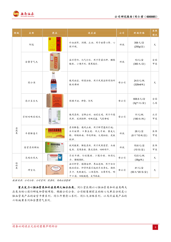 同仁堂拥有800余个中成药品规,常年生产超过400种,独家品种达40余种,形成了涵盖心脑血管类、补益类、清热类、妇科类等多元化的产品矩阵。公司重点发力心脑血管类和补益类两大细分品类,其销售额前五的核心大单品包括安宫牛黄系列、同仁牛黄清心系列、同仁大活络系列、六味地黄系列和金匮肾气系列。