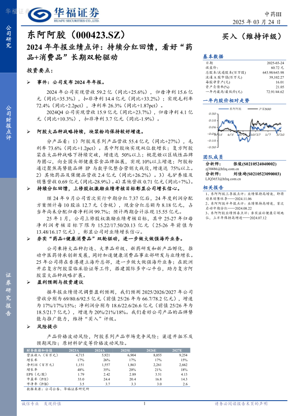 本报告对东阿阿胶2024年年报进行了全面解读,认为公司在业绩增长、产品战略、股东回报和未来发展规划等方面均表现出色。公司坚持阿胶大品种战略,积极拓展海外市场,并持续进行高比例分红,充分展现了其稳健的经营能力和对股东利益的重视。维持“买入”评级,但同时也提示了相关风险。