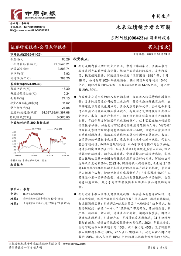 东阿阿胶作为国内阿胶行业的龙头企业,在华润集团的战略引领下,通过“药品+健康消费品”双轮驱动的业务模式,实现了2024年业绩的强劲增长,归母净利润和扣非净利润均实现30%左右的同比增长。公司在阿胶块、复方阿胶浆、桃花姬、阿胶粉等核心产品线上均展现出明确的增长策略和市场拓展潜力,并通过数字化营销、品牌焕新和研发创新不断巩固市场地位。股权激励计划的实施,进一步为公司未来高质量发展提供了制度保障。分析师对公司未来业绩增长充满信心,并给予“买入”评级,预计公司将持续保持稳健的盈利能力和市场竞争力。