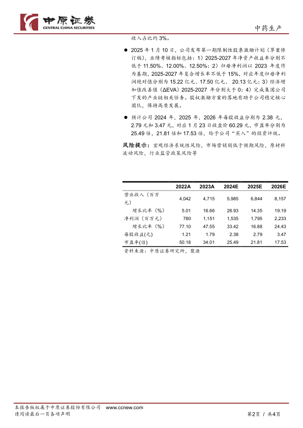 分析师预计公司2024年、2025年、2026年每股收益分别为2.38元、2.79元和3.47元。基于2025年1月23日收盘价60.29元,对应市盈率分别为25.49倍、21.81倍和17.53倍。鉴于公司稳健的业绩增长和清晰的战略规划,分析师首次给予公司“买入”的投资评级。同时,报告提示了宏观经济系统性风险、市场营销低于预期风险、原材料波动风险以及行业监管政策风险。