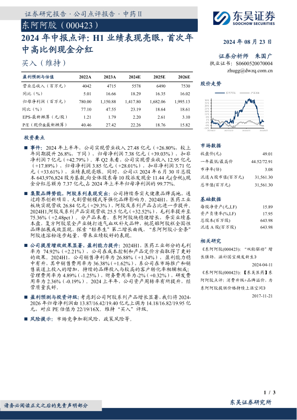 盈利预测与投资评级:考虑到公司阿胶系列产品增长显著,我们将2024-2026年归母净利润由13.87/16.42/19.40亿元上调为14.18/16.82/19.95亿元,对应PE估值为22/19/16X。维持“买入”评级。
