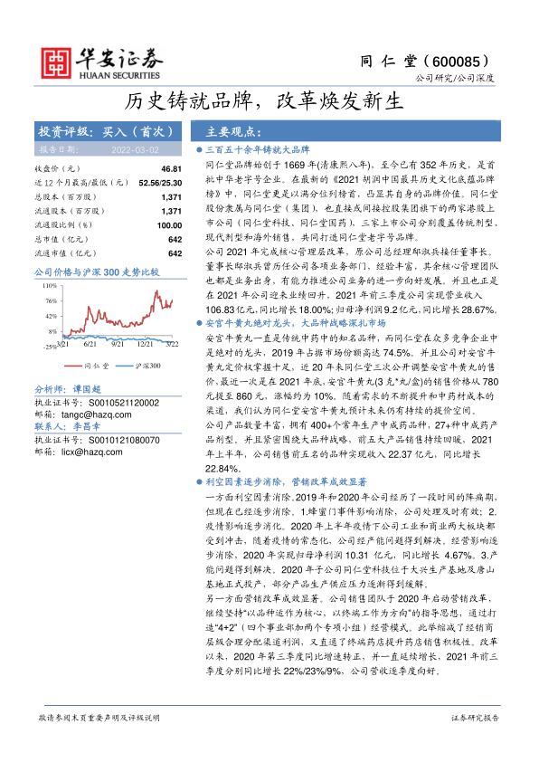 本报告深入分析了同仁堂(600085)作为拥有352年历史的中华老字号,如何通过品牌传承、管理层改革和营销创新实现业绩的显著回升。公司凭借其在《2021胡润中国最具历史文化底蕴品牌榜》中的榜首地位,凸显了其卓越的品牌价值。2021年核心管理层的调整,特别是新任董事长邸淑兵的领导,为公司带来了新的发展动力,推动2021年前三季度营收和归母净利润分别实现18.00%和28.67%的同比增长。