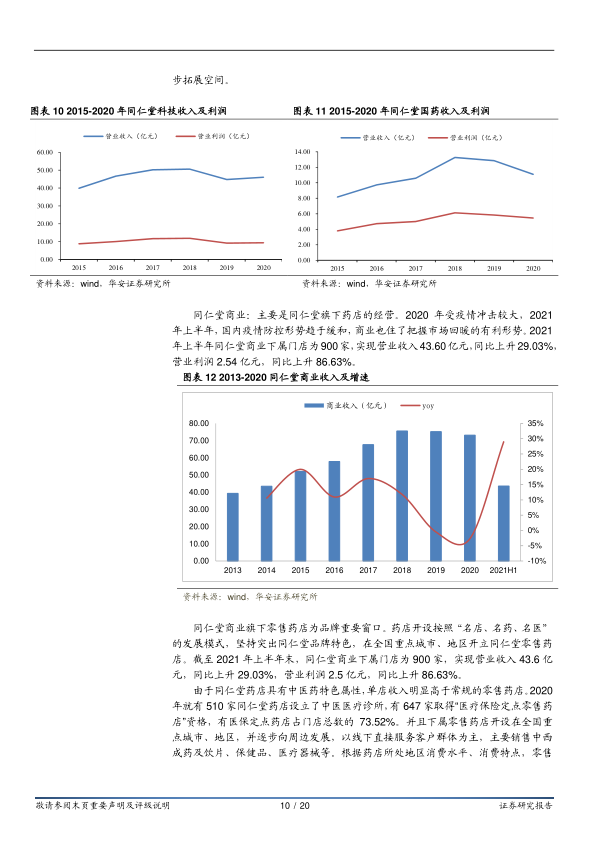 同仁堂三大核心子公司均迎来好转。同仁堂科技在2020年大兴及唐山两个生产基地投产后,产能问题得到解决,2021年上半年实现营业收入27.66亿元,同比增长23.45%;净利润3.15亿元,同比增长10.58%。同仁堂国药主要负责海外市场,2021年上半年实现营业收入7.07亿元,同比增长22.87%;净利润2.67亿元,同比增长17.94%,随着中药逐步获得海外认同,其有望进一步拓展空间。同仁堂商业旗下零售药店截至2021年上半年末达900家,实现营业收入43.60亿元,同比增长29.03%,营业利润2.54亿元,同比增长86.63%,其单店收入明显高于其他上市连锁药店,凸显中医药特色属性。