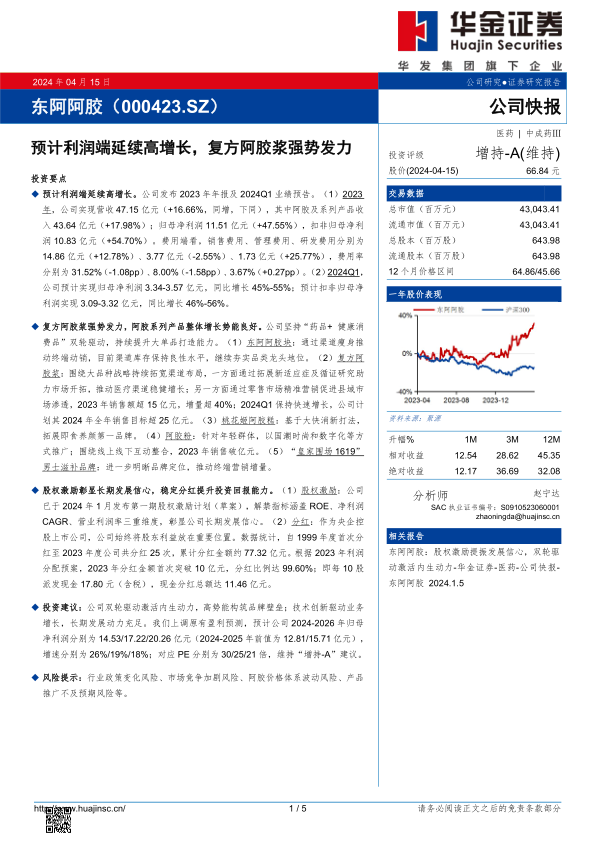 本报告对东阿阿胶(000423.SZ)的2023年年报及2024年一季度业绩进行了分析,并上调了盈利预测,维持“增持-A”评级。