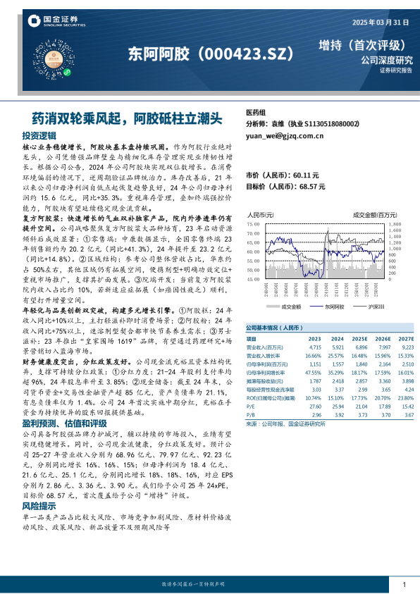 基于阿胶块的品牌力、复方阿胶浆的渗透率提升以及阿胶糕、阿胶粉等健康消费品的快速增长,预计公司2025-2027年营业收入将分别达到68.96亿元、79.97亿元、92.23亿元,分别同比增长16%、16%、15%。归母净利润预计分别为18.4亿元、21.6亿元、25.1亿元,分别同比增长18%、18%、16%,对应EPS分别为2.86元、3.36元、3.90元。公司毛利率预计保持在71.4%-72.0%之间,销售费用率短期内因品牌投入将维持在较高水平,预计2025-2027年分别为32.0%、31.0%、30.5%。综合考虑公司强大的品牌力、稳健的业绩增长、健康的现金流和友好的分红政策,参考片仔癀、云南白药、同仁堂等可比中药企业,给予公司2025年24倍PE,目标价68.57元,首次覆盖给予“增持”评级。