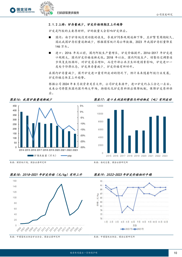 补气补血类市场持续扩容,根据中康开思数据,2023年零售终端销售额突破160亿元,同比增长21.7%。在这一市场中,东阿阿胶凭借其强大的品牌力,在补血中成药产品和品牌中均位列前二。2024年,公司阿胶块零售终端市占率高达67.4%,尽管2024年阿胶在全国零售终端销售额受消费环境影响同比下降13%至56亿元,但公司阿胶块仍实现双位数增长,逆周期验证了其品牌统治力。上游方面,驴皮作为阿胶主要原材料,国内驴存栏量持续减少(2023年降至146万头),进口驴皮供应亦有波动,预计未来驴皮价格总体呈上升趋势。公司通过聚焦国内外两大市场,持续优化驴皮原料供应保障机制。下游渠道方面,公司自2019年起重视渠道库存管理,通过“去库存、保增长”营销策略,使库存状况显著改善。2022年3月启动的“生态共赢·春雷行动”专项行动,利用二维码和物联网技术治理产品价格乱象,有效维护了市场秩序和价格生态。