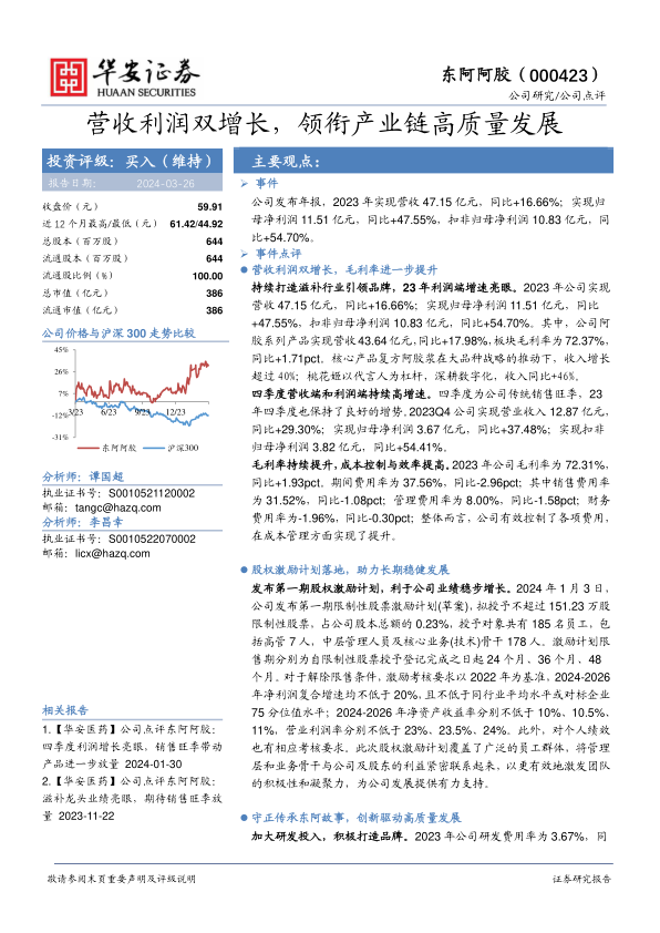 东阿阿胶2023年营收和利润实现双增长,核心产品表现强劲,毛利率持续提升。公司通过股权激励计划、加大研发投入和积极的品牌建设,为未来的可持续增长奠定了坚实基础。维持“买入”评级,看好公司未来长期发展。