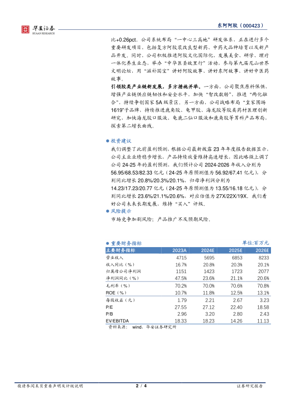 加大研发投入,积极打造品牌。2023年公司研发费用率为3.67%,同比+0.26pct。公司系统布局“一中心三高地”研发体系,正在进行多个重要研发项目,包括复方阿胶浆改良型新药、中药大品种培育以及新产品开发。同时,公司积极推进阿胶文化国际化,发展美食、研学、理疗一体化养生业态,举办“中华医圣故里行”活动,参与第九届尼山世界文明论坛,用“滋补国宝”讲好阿胶故事、讲好东阿故事、讲好中医药故事。