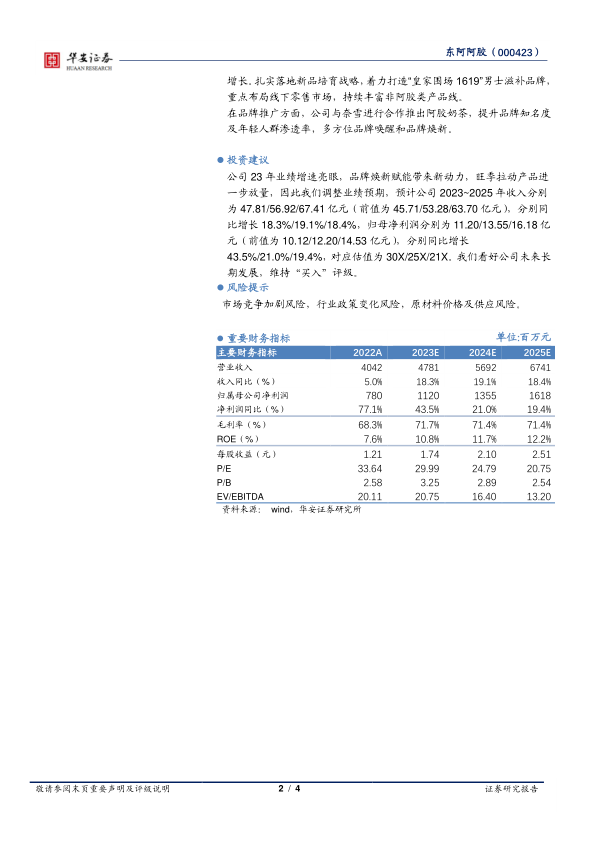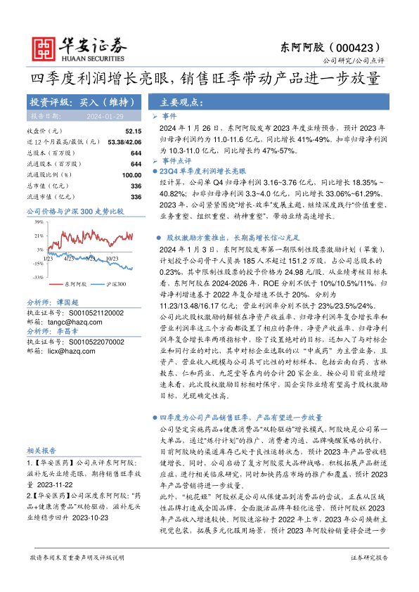 本报告认为,东阿阿胶2023年业绩增长亮眼,股权激励计划彰显长期增长信心,产品销售策略和品牌推广活动有效,维持“买入”评级。