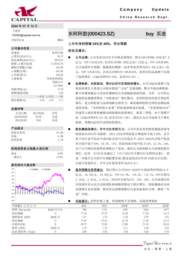 公司24Q2高基期下延续较快增长主要是公司稳步推进“1238”发展战略,整合升级品牌焕新,数字化精准触达与内容传播相结合全面赋能渠道发展;另外,公司坚定落地药品健康消费品“双轮驱动”增长模式,东阿阿胶块价值引领良性增长,复方阿胶浆大品种战略全面发力,桃花姬阿胶糕全国性品牌拓展成效显现,“东阿阿胶小金条”阿胶速溶粉逐步起量,“皇家围场1619”传递男士滋补新热潮推动绩稳健高质量增长。展望三季度,由于基期不高(23Q3净利YOY+23.4%,扣非后YOY+14%),认为公司延续当下增长趋势,预期24Q3仍可录得较快增长。