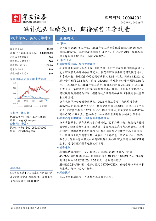 本报告对东阿阿胶2023年三季报进行了深入分析,认为公司业绩增长迅猛,费用控制合理,品牌建设和市场拓展积极有效。维持对公司未来收入和利润的预测,并维持“买入”评级。同时,报告也提示了市场竞争和产品推广等风险。