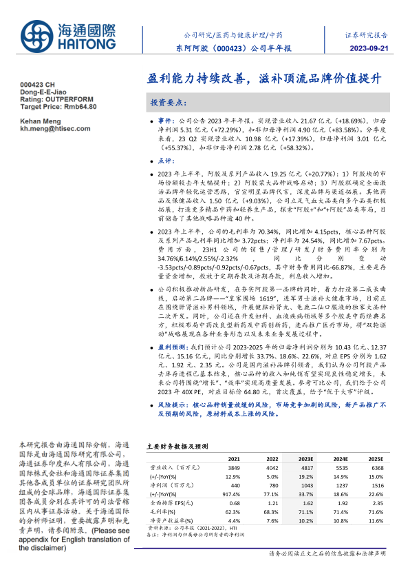 本报告对东阿阿胶2023年半年报进行了全面分析,指出公司盈利能力持续改善,阿胶系列产品市场份额提升,同时积极进行新品研发和战略布局,打造第二增长曲线。预计公司未来三年净利润将保持稳定增长,首次覆盖给予“优于大市”评级,目标价64.80元。但同时也提示了核心品种销量放缓、市场竞争加剧、新产品推广不及预期以及原材料成本上涨等风险。
