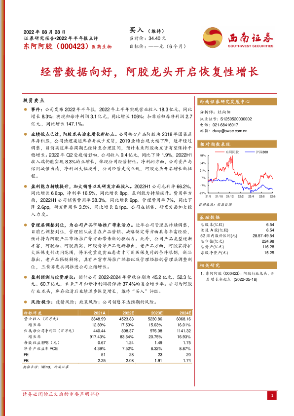 盈利预测与投资建议:预计公司 2022-2024 年营收分别为 45.2 亿元、52.3 亿元、60.7 亿元,未来三年归母净利润将保持 37.4%的复合增长率。公司为阿胶行业龙头,库存出清后业绩逐步恢复增长,维持“买入”评级。