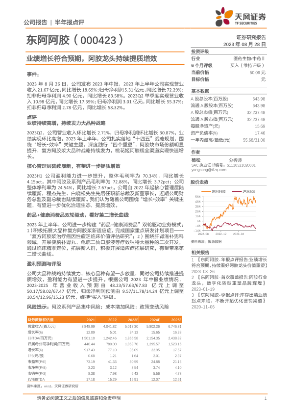 本报告分析了东阿阿胶2023年中报,认为公司业绩增长符合预期,大品种战略持续发力,盈利能力提升,管理层优化,并积极拓展新的增长曲线。基于公司业绩,上调了未来几年的营收和利润预测,维持“买入”评级。但同时也提示了阿胶系列产品集中、成本增加和政策变动等风险。