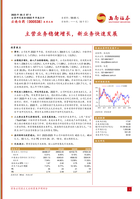 本报告通过对云南白药2022年年报的详细解读,分析了公司在主营业务、研发投入和新业务拓展等方面的表现。公司核心业务稳健增长,新业务发展迅速,研发投入持续加大,为未来的发展奠定了基础。基于对公司未来盈利能力的预测,建议投资者保持关注。同时,报告也提示了潜在的风险,提醒投资者谨慎投资。