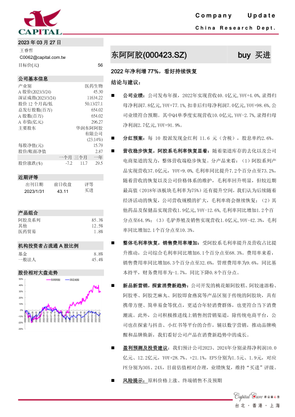 新品新营销,探索消费新趋势:公司开发的桃花姬阿胶糕、阿较速溶粉、阿胶枣、阿胶芝麻丸、阿胶即食燕窝等产品区别于传统的阿胶块,具有携带方便、简单易食等优点,更适合年轻消费群体,也更符合当下消费潮流。此外,公司积极推进线上销售剂营销渠道,除传统电商平台,公司也在探索与抖音、小红书等平台的合作,辅以数字营销,推动品牌唤醒和品牌焕新,我们看好公司产品在消费新趋势中的成长。