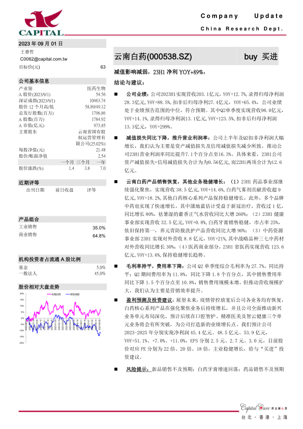 本报告对云南白药(000538.SZ)进行了更新分析,维持“买进”评级,目标价63元。
