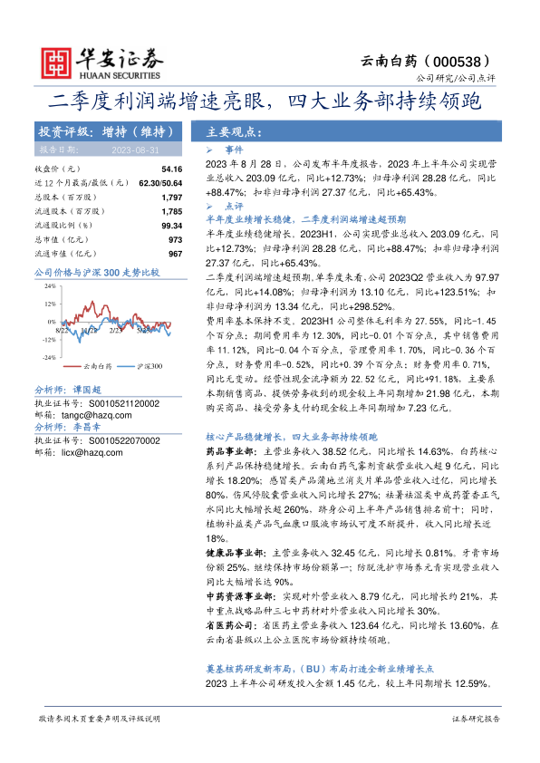 云南白药2023年半年度报告显示,公司业绩稳健增长,尤其二季度利润端增速超预期。核心业务板块如药品事业部、健康品事业部、中药资源事业部和省医药公司均保持领先地位。