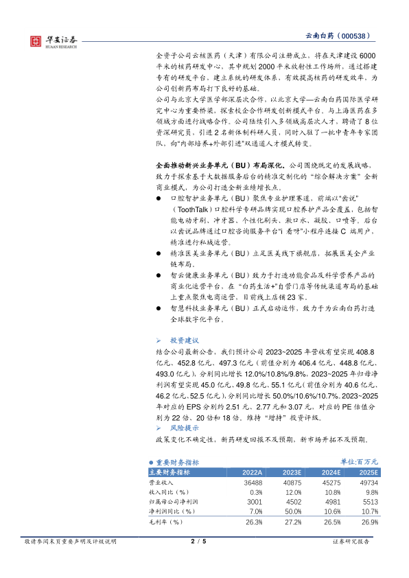 考虑到公司良好的业绩表现和未来的增长潜力,华安证券维持对云南白药的“增持”投资评级,并给出了未来几年的营收和利润预测。投资者应关注政策变化、新药研发和市场开拓等风险因素。
