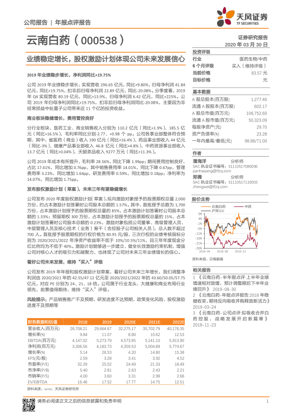 云南白药在2019年实现了营收和归母净利润的稳健增长,尽管扣非后净利润受非经常性损益影响有所波动,但其商业板块表现强劲,且费用管控得当,净利率有所提升。公司发布的股权激励计划,通过设定明确的业绩考核目标,有效增强了核心团队的凝聚力,并传递出管理层对未来三年业绩持续增长的坚定信心。鉴于公司作为行业龙头的地位及其在大健康和商业领域的领先布局,分析师维持“买入”评级,并上调了未来三年的净利润预测,认为公司未来发展前景值得期待。