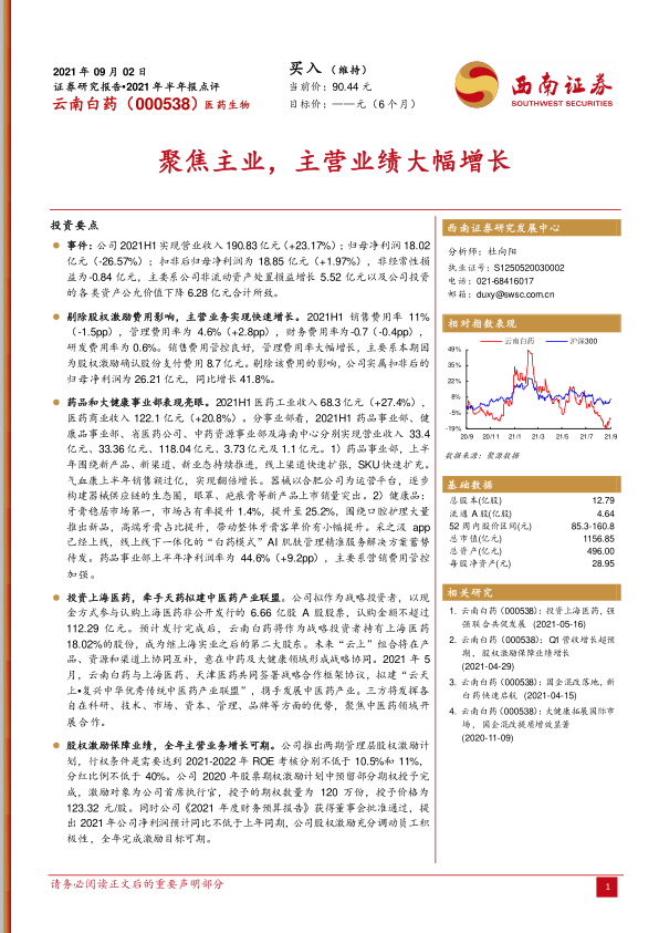 云南白药在2021年上半年展现出强劲的主营业务增长势头,营业收入和剔除股权激励影响后的扣非净利润均实现显著增长,表明公司核心业务的健康发展和盈利能力的提升。药品和大健康事业部表现突出,新产品和新渠道的拓展成效显著,尤其在牙膏市场保持领先地位并积极布局高端产品和AI肌肤管理。公司通过战略投资上海医药并牵头组建中医药产业联盟,旨在构建更广阔的产业生态和协同效应,为长期发展注入新动力。同时,股权激励计划的实施,以明确的业绩考核目标,有效激发了管理层和员工的积极性,为公司未来业绩增长提供了坚实保障。综合来看,云南白药凭借其稳固的市场地位、持续的业务创新、前瞻性的战略布局以及有效的激励机制,未来增长潜力巨大,维持“买入”评级。