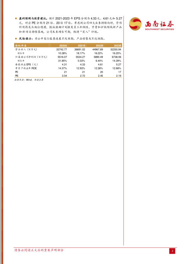 盈利预测与投资建议。预计2021-2023年EPS分别为4.33元、4.61元和5.27元,对应PE分别为21倍、20倍17倍。考虑到公司四大业务持续向好,骨伤科用药龙头地位稳固,股权激励计划激发员工积极性,牙膏和护肤领域新产品和新项目持续落地,公司未来增长可期,维持“买入”评级。