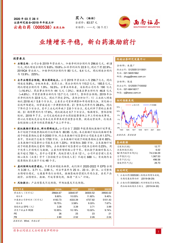 云南白药在2019年实现了营收和归母净利润的稳健增长,尽管扣非净利润因战略调整和毛利率变化有所下滑,但公司通过整体上市完成了关键的战略转型。同时,公司推出的2020年股票期权激励计划,旨在通过激发核心团队活力,为未来的持续发展注入动力。分析师基于公司稳定的业绩增长、领先的大健康布局以及股权激励带来的积极影响,对公司未来盈利能力持乐观态度,并维持“买入”评级,但同时提示了产品销售和市场拓展可能面临的风险。
