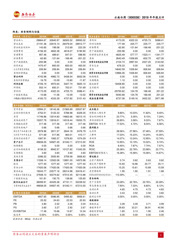 云南白药在2019年实现了营业收入和归母净利润的平稳增长,分别达到296.6亿元和41.8亿元,同比增速分别为9.8%和19.8%。尽管扣非净利润同比下滑22.9%,主要受销售队伍调整、毛利率下降等因素影响,但公司通过完成吸收合并白药控股实现整体上市,为未来的资源整合和运营效率提升奠定了基础,标志着公司迈向“新白药新起点”。