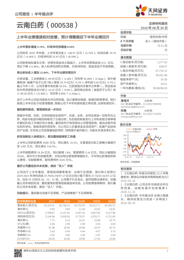 本报告分析了云南白药2019年半年度报告,指出公司上半年业绩增速放缓,但重组顺利推进,管理层级进一步优化。医药商业板块收入增加,牙膏市场份额跃居国内第一。公司研发投入持续加大,更加重视提高职工待遇。维持“买入”评级,但需关注重组整合进度和产品销售推广等风险。