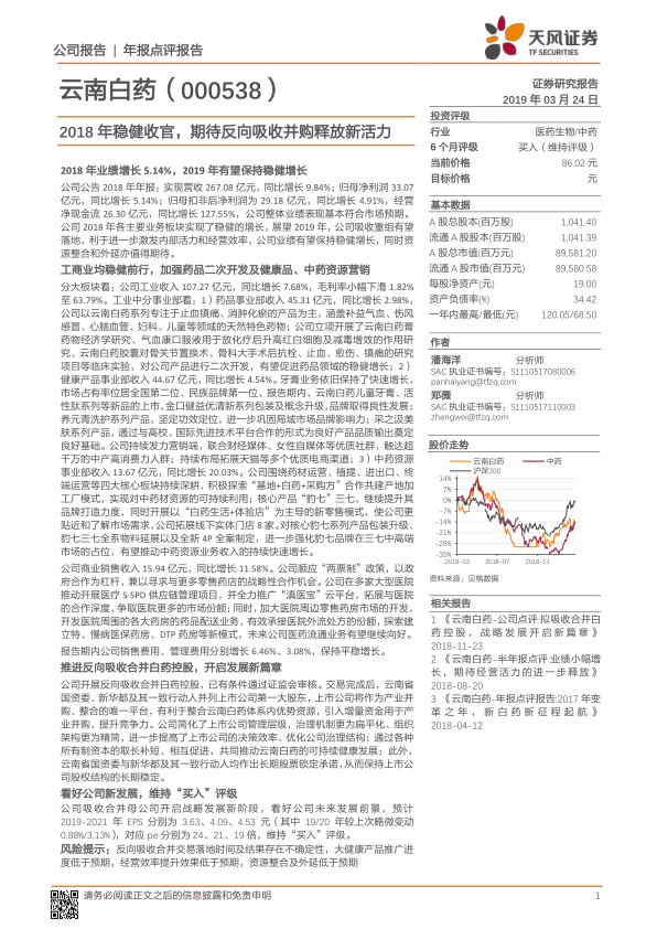 云南白药2018年业绩稳健收官,营收和净利润均实现增长,符合市场预期。展望未来,公司吸收重组有望落地,有望进一步激发内部活力和经营效率,公司业绩有望保持稳健增长,同时资源整合和外延亦值得期待。