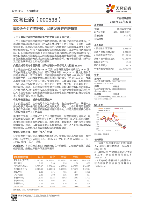 公司吸收合并母公司开启战略发展新阶段,看好公司未来发展前景,预计2018-2020年EPS分别为3.25、3.60、3.97元,对应pe分别为22、20、18倍,维持“买入”评级。