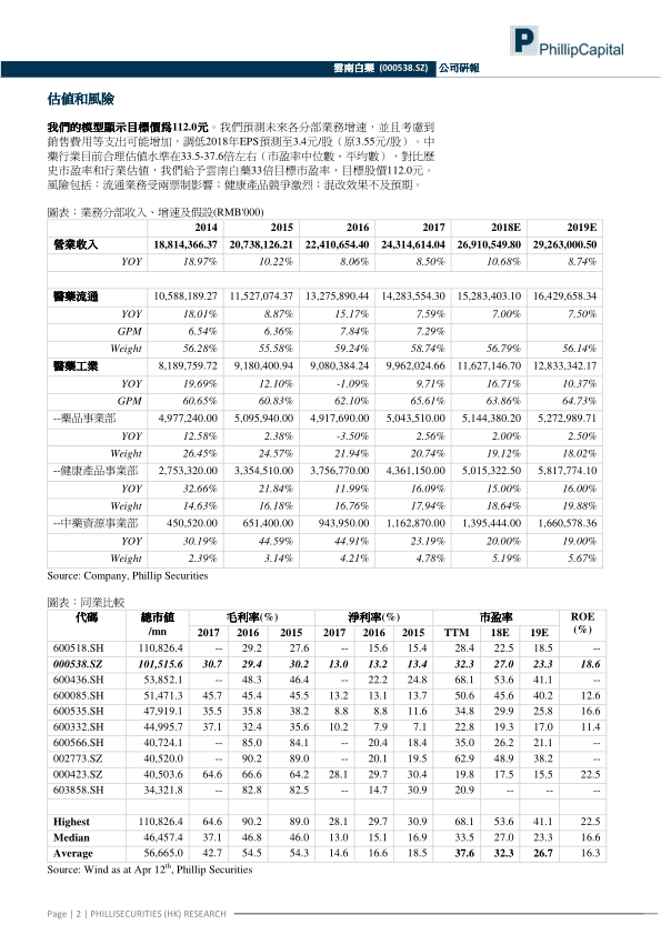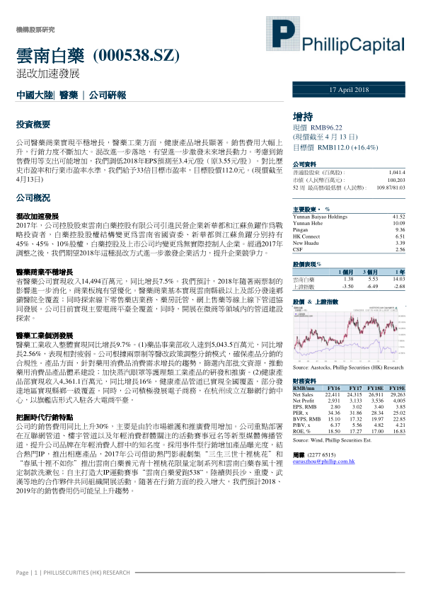 本报告分析了云南白药的混改进展、业务发展和市场营销策略。公司医药商业保持平稳增长,医药工业中的健康产品表现亮眼。混改有望进一步激发企业活力。考虑到销售费用增加,略微调低盈利预测,但维持“增持”评级,目标价112.0元。同时,报告也提示了流通业务受两票制影响、健康产品竞争激烈以及混改效果不及预期等风险。