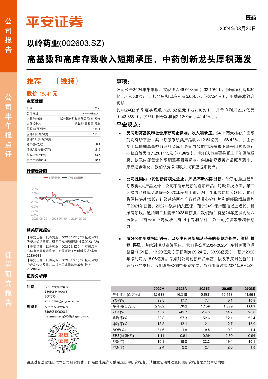 以岭药业2024年上半年业绩受高基数和库存影响,收入和利润出现下滑。但公司作为中药创新龙头企业,不断推出新产品,长期发展潜力仍然值得期待。平安证券维持对以岭药业的“推荐”评级,但同时也提示了研发风险、降价风险和政策风险。
