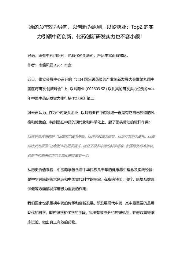 近日,雄安会展中心召开的“2024国际医药服务产业创新发展大会暨第九届中国医药研发·创新峰会”上,以岭药业(002603.SZ)以扎实的研发实力位列《2024年中国中药研发实力排行榜TOP50》第二!
