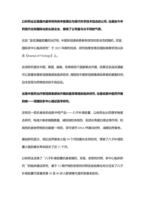 比如“连花清瘟胶囊的治疗轻、中度新冠感染患者有效性和安全性的随机、双盲、国际多中心临床研究”于2023年顺利完成,研究结果发表在国际病毒学顶尖杂志《Journal of Virology》上。