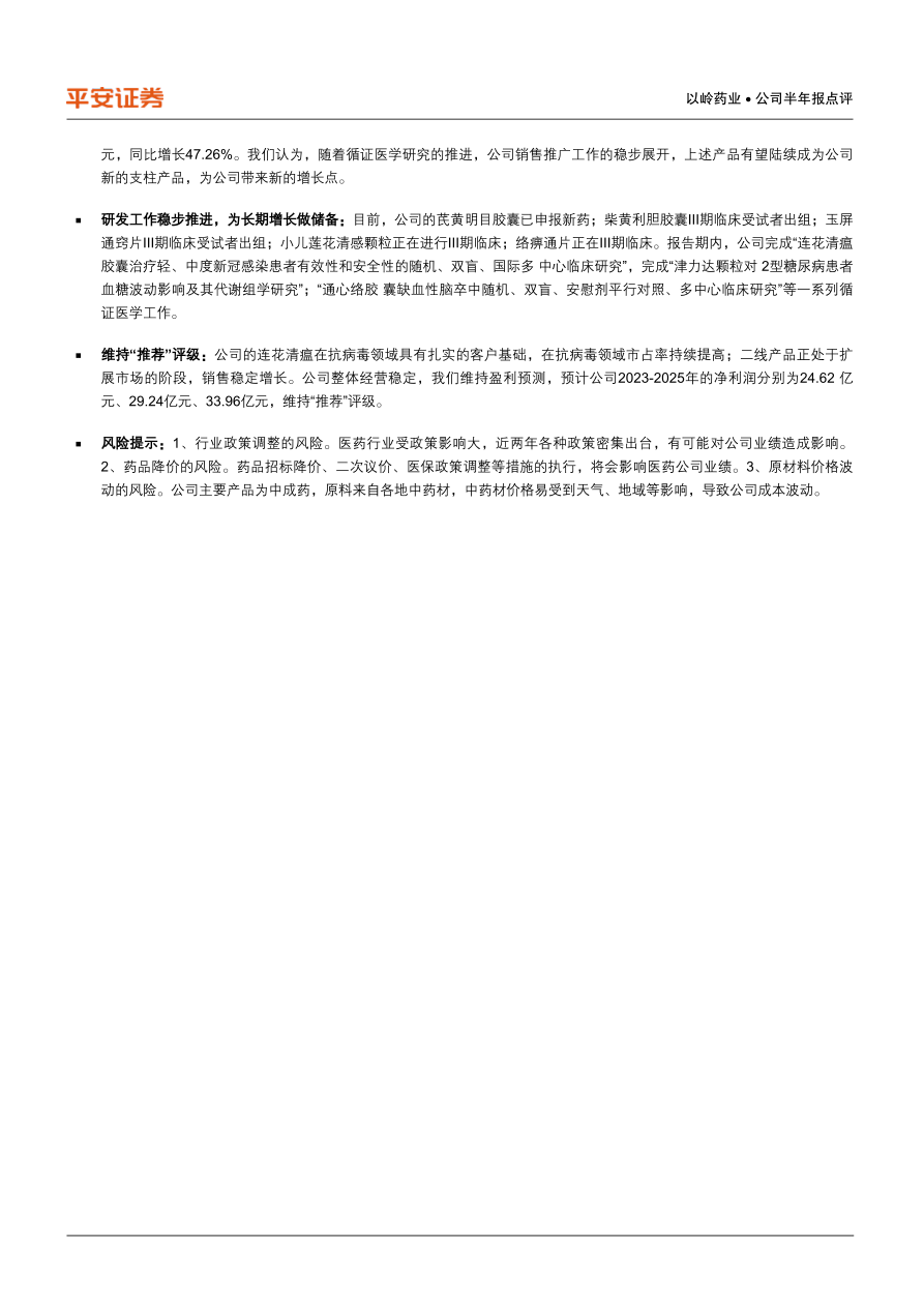 以岭药业在2023年上半年展现出强劲的业绩增长势头,主要得益于呼吸系统类药物的市场需求爆发和心脑血管类产品的稳健复苏。公司通过持续的研发投入和循证医学研究,不断丰富产品管线并提升核心产品的市场竞争力。尽管面临行业政策、药品降价和原材料成本波动等风险,但其多元化的产品布局和创新驱动战略有望支撑公司实现持续发展,维持其在医药市场的推荐评级。