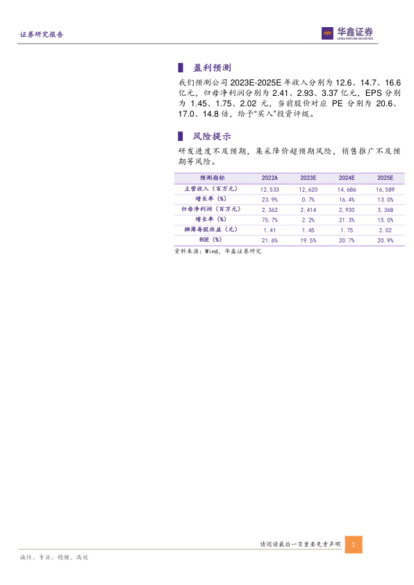 我们预测公司2023E-2025E年收入分别为12.6、14.7、16.6亿元,归母净利润分别为2.41、2.93、3.37亿元,EPS分别为1.45、1.75、2.02元,当前股价对应PE分别为20.6、17.0、14.8倍,给予“买入”投资评级。