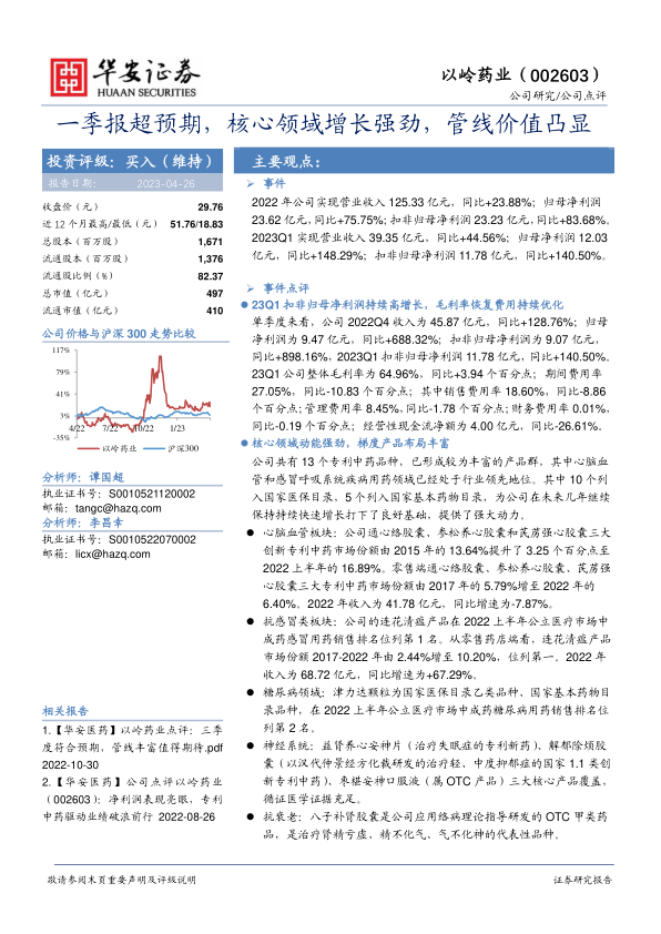 本报告分析了以岭药业2022年年报和2023年一季报,指出公司一季度业绩超出预期,主要得益于核心领域(心脑血管、抗感冒)的强劲增长和产品结构的丰富。同时,毛利率的提升和费用控制的优化也显著提升了公司的盈利能力。