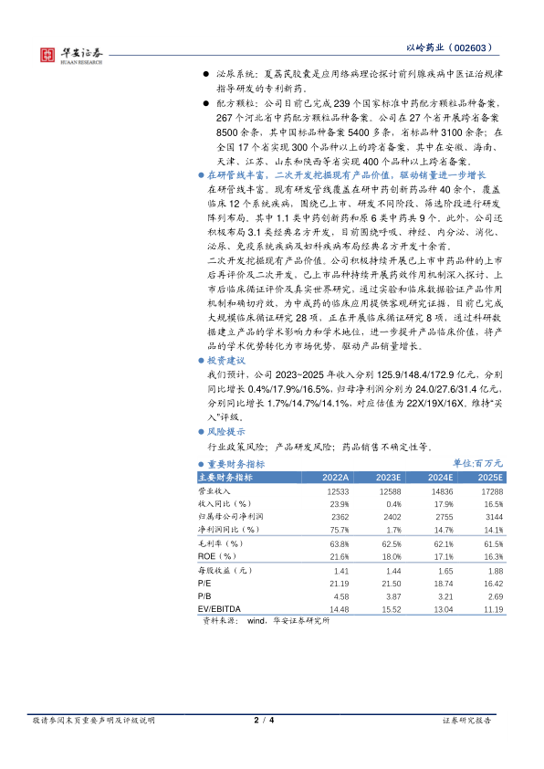 报告强调了公司丰富在研管线的价值,以及通过二次开发挖掘现有产品价值的策略,认为这将驱动公司销量进一步增长。基于对公司未来盈利能力的预测,维持对以岭药业“买入”的投资评级。