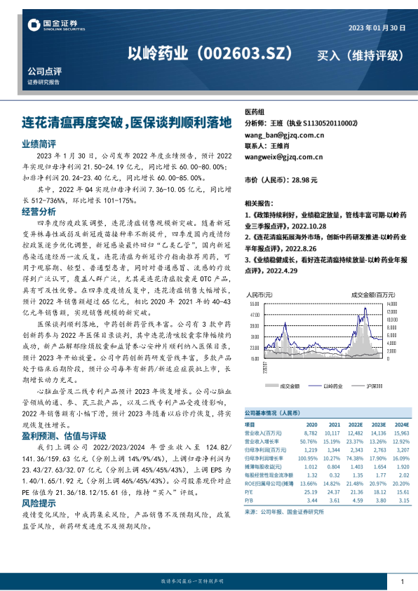 本报告的核心观点在于,以岭药业在2022年受益于防疫政策调整和连花清瘟的销售突破,业绩大幅增长。同时,医保谈判顺利落地,中药创新药管线丰富,为公司未来发展提供充足动力。
