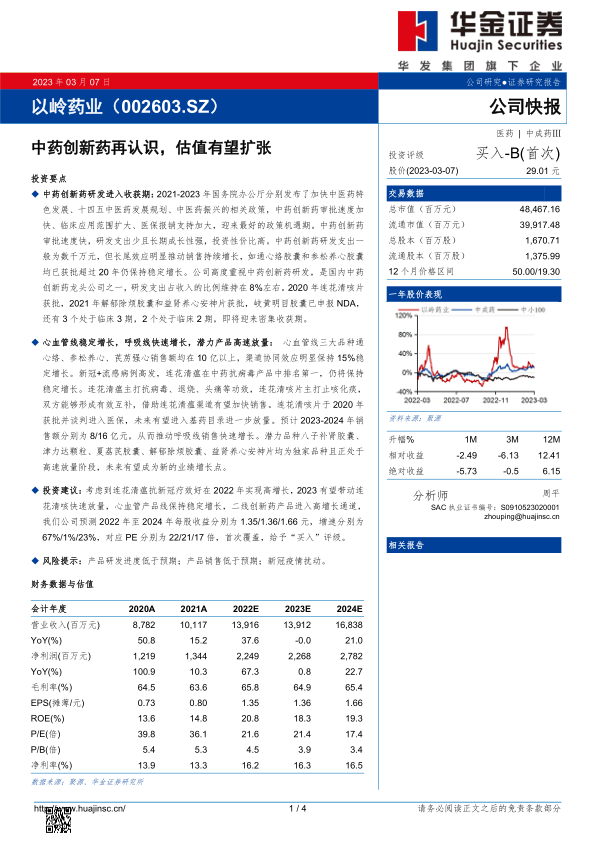 投资建议:考虑到连花清瘟抗新冠疗效好在2022年实现高增长,2023有望带动连花清咳快速放量,心血管产品线保持稳定增长,二线创新药产品进入高增长通道,我们公司预测2022年至2024年每股收益分别为1.35/1.36/1.66元,增速分别为67%/1%/23%,对应PE分别为22/21/17倍,首次覆盖,给予“买入”评级。