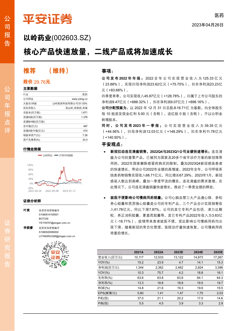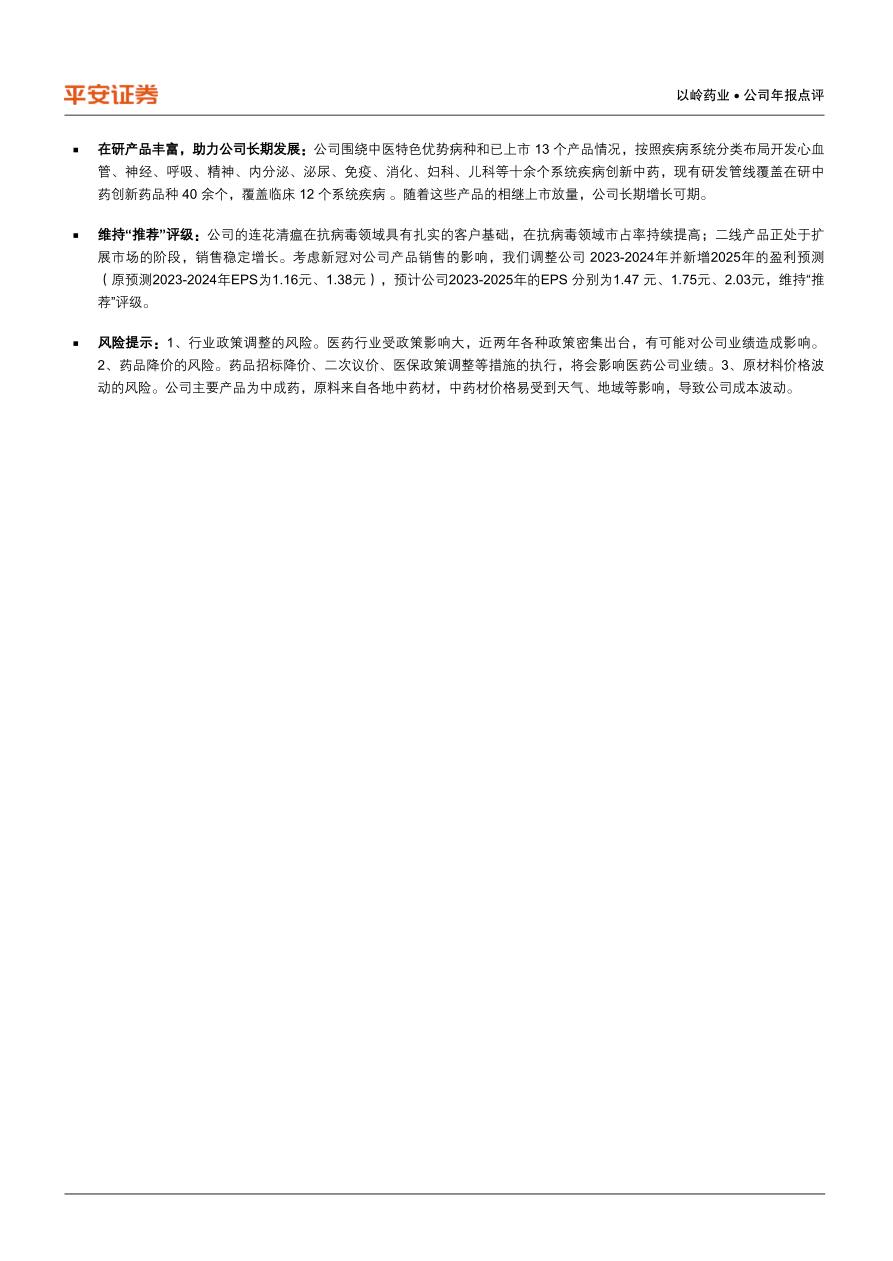 维持“推荐”评级:公司的连花清瘟在抗病毒领域具有扎实的客户基础,在抗病毒领域市占率持续提高;二线产品正处于扩展市场的阶段,销售稳定增长。考虑新冠对公司产品销售的影响,我们调整公司2023-2024年并新增2025年的盈利预测(原预测2023-2024年EPS为1.16元、1.38元),预计公司2023-2025年的EPS分别为1.47元、1.75元、2.03元,维持“推荐”评级。