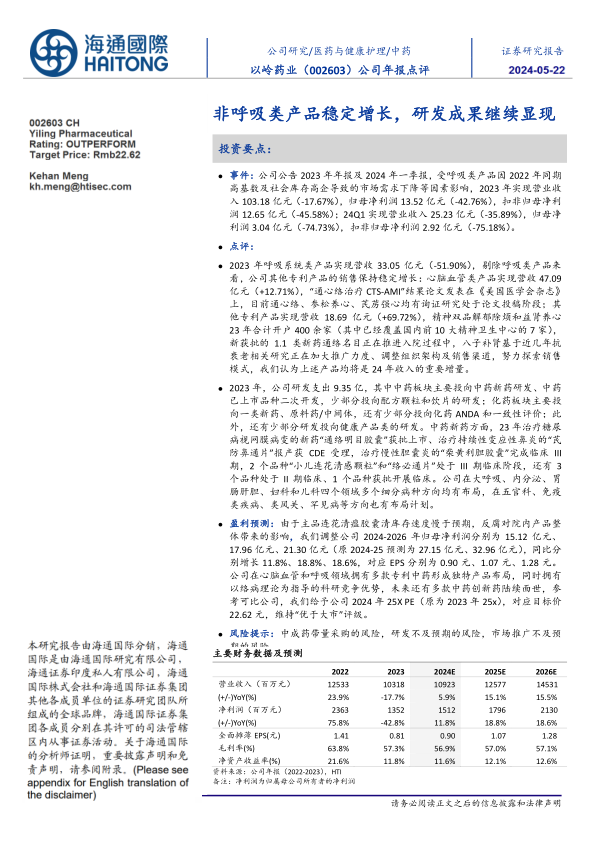 盈利预测:由于主品连花清瘟胶囊清库存速度慢于预期,反腐对院内产品整体带来的影响,我们调整公司2024-2026年归母净利润分别为15.12亿元、17.96亿元、21.30亿元(原2024-25预测为27.15亿元、32.96亿元),同比分别增长11.8%、18.8%、18.6%,对应EPS分别为0.90元、1.07元、1.28元。公司在心脑血管和呼吸领域拥有多款专利中药形成独特产品布局,同时拥有以络病理论为指导的科研竞争优势,未来还有多款中药创新药陆续面世,参考可比公司,我们给予公司2024年25X PE(原为2023年25x),对应目标价22.62元,维持“优于大市”评级。