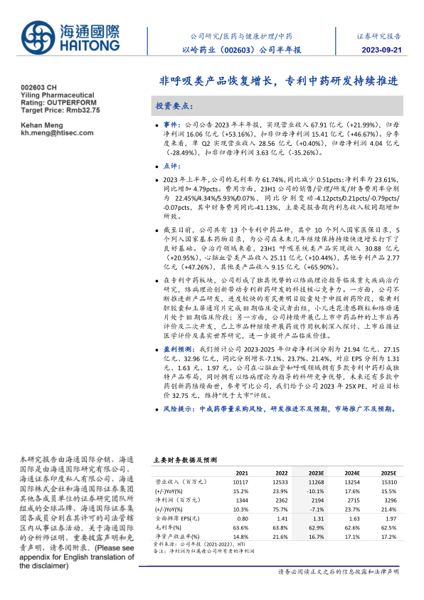 本报告对以岭药业2023年半年度业绩进行了全面分析,认为公司在非呼吸类产品恢复增长、专利中药研发持续推进等方面具有优势。维持“优于大市”评级,但同时也提示了相关风险。