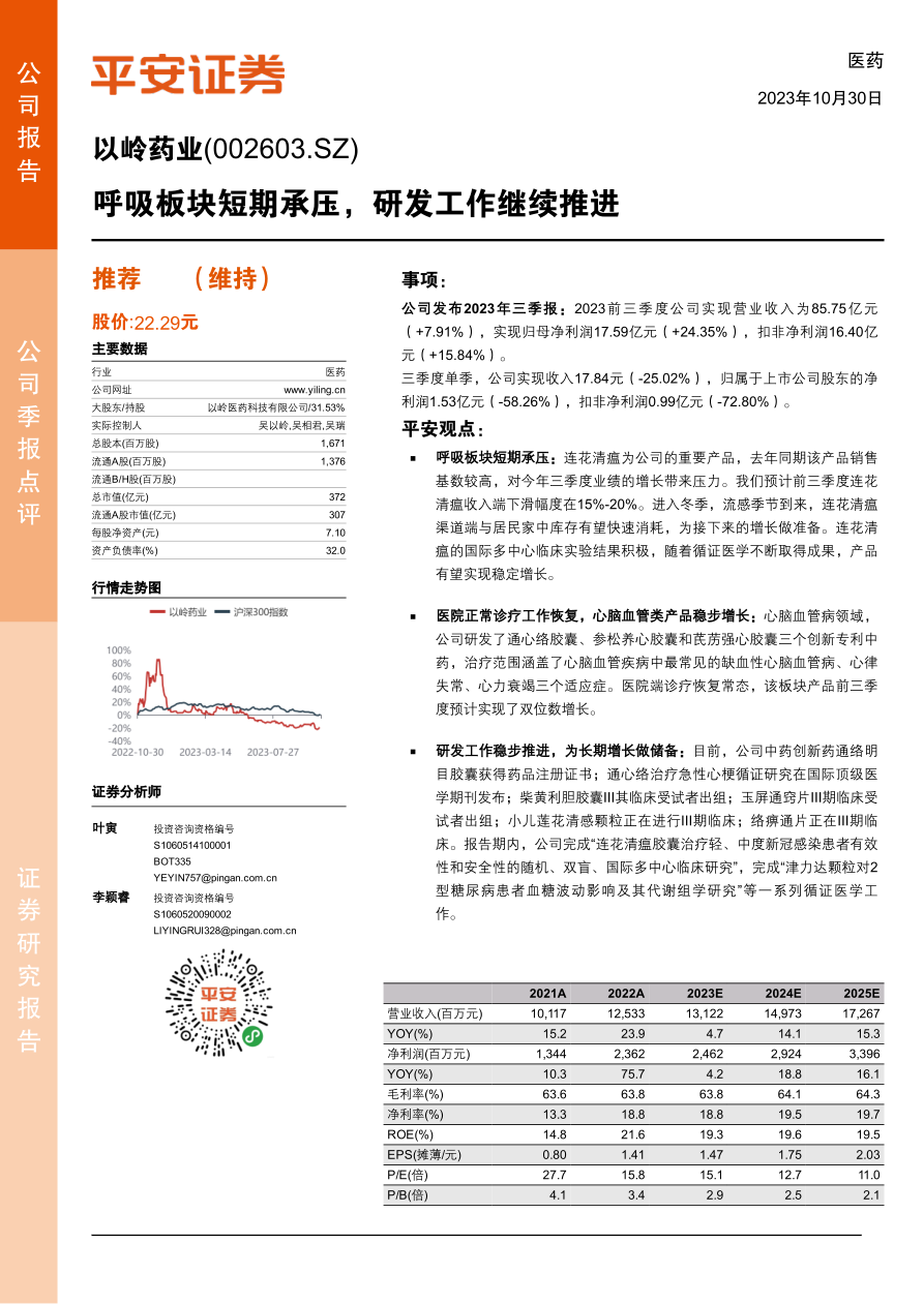 本报告分析了以岭药业2023年三季报,指出公司呼吸板块短期承压,但心脑血管产品稳步增长,研发工作持续推进。报告维持“推荐”评级,并对公司未来盈利进行了预测,同时提示了行业政策、药品降价和原材料价格波动等风险。