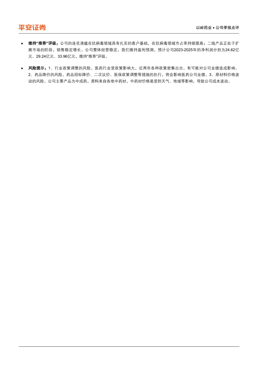 维持“推荐”评级:公司的连花清瘟在抗病毒领域具有扎实的客户基础,在抗病毒领域市占率持续提高;二线产品正处于扩展市场的阶段,销售稳定增长。公司整体经营稳定,我们维持盈利预测,预计公司2023-2025年的净利润分别为24.62亿元、29.24亿元、33.96亿元,维持“推荐”评级。