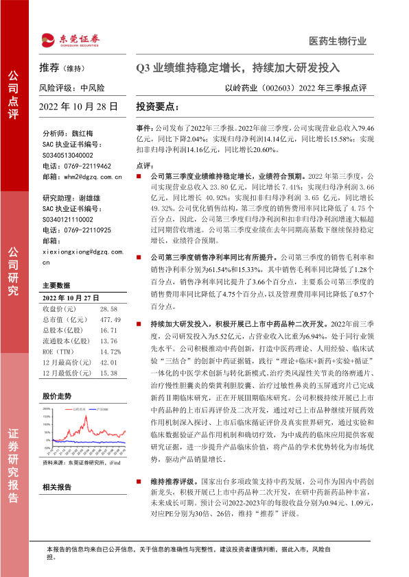 本报告的核心观点是:以岭药业在2022年第三季度维持了稳定的业绩增长,并且持续加大研发投入,尤其是在已上市中药品种的二次开发方面。