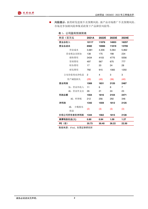 风险提示:新药研发进展不及预期风险、新产品市场推广不及预期风险、市场竞争加剧风险和集采政策下产品降价风险等。