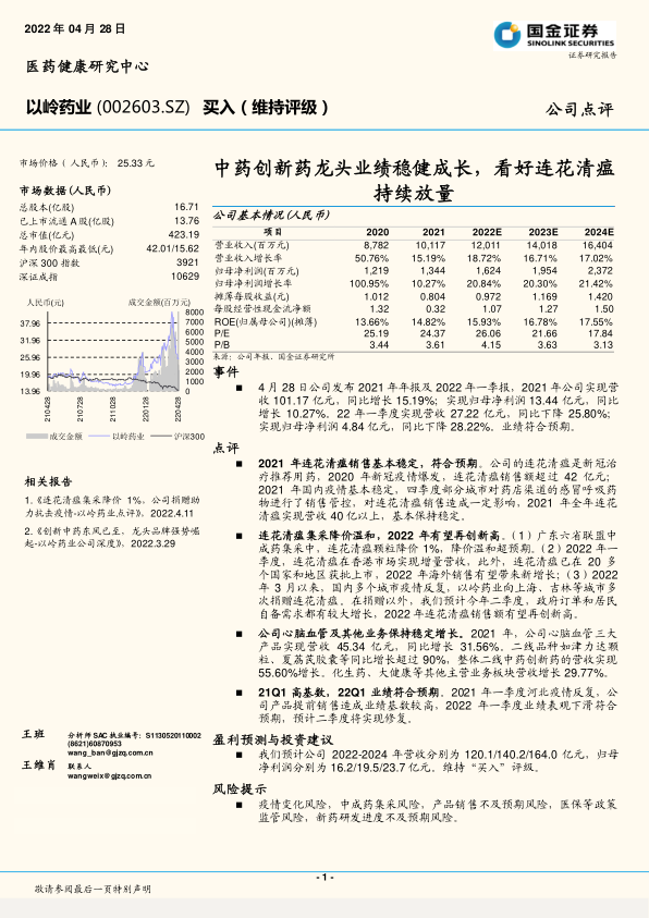 本报告对以岭药业(002603.SZ)进行了专业而深入的分析。报告指出,公司在2021年实现了营收101.17亿元和归母净利润13.44亿元的稳健增长。尽管2022年一季度业绩因高基数效应出现表观下滑,但符合预期,并有望在二季度得到修复。核心产品连花清瘟在2021年销售额保持在40亿元以上,且在2022年有望凭借温和的集采降价、海外市场扩张以及国内疫情反复带来的需求增长而再创新高。同时,公司心脑血管产品及其他二线创新中药业务也保持了强劲的增长势头,2021年心脑血管产品营收达45.34亿元,同比增长31.56%,二线创新中药营收增长55.60%。