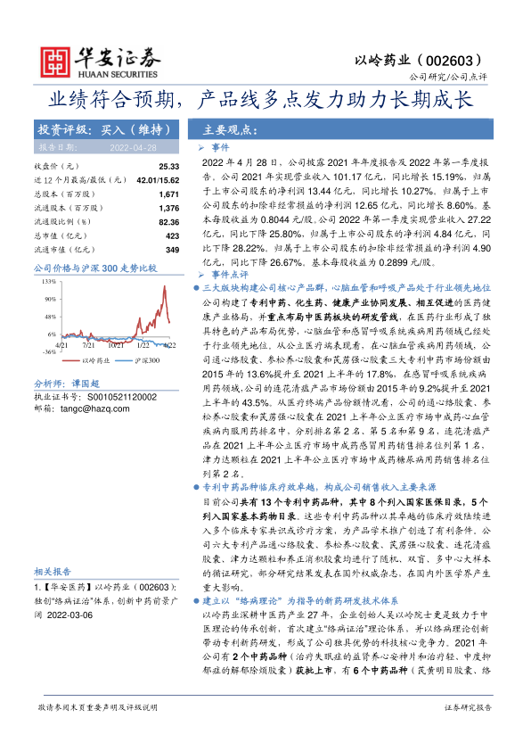 本报告对以岭药业2021年年度报告及2022年第一季度报告进行了解读,认为公司业绩符合预期,维持“买入”评级。报告强调了公司在心脑血管和呼吸系统疾病用药领域的领先地位,以及专利中药品种的卓越临床疗效对公司销售收入的重要贡献。